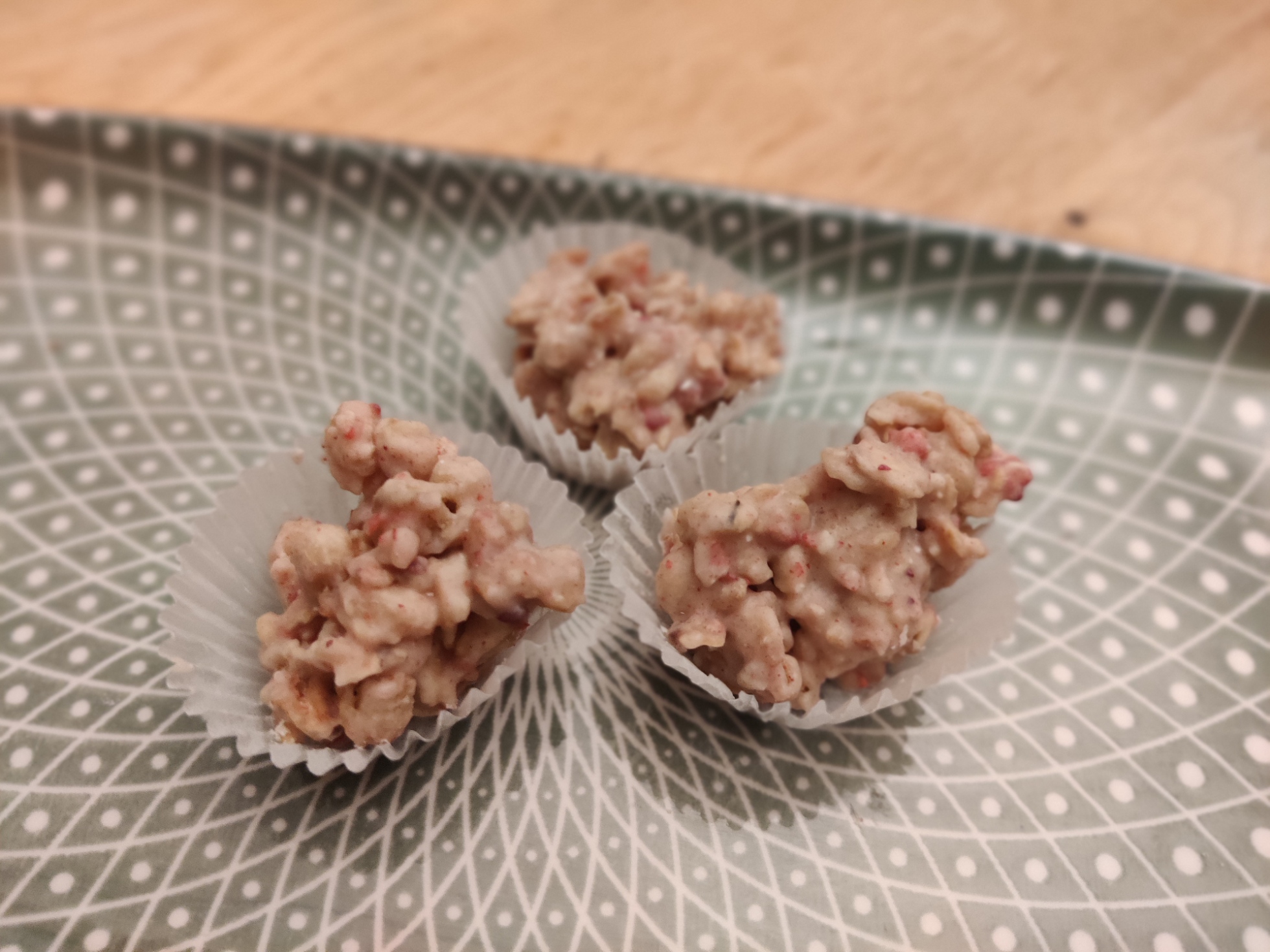 Sämtliche Zutaten gut vermengen und mit einem Teelöffel kleine Häufchen auf Backpapier setzten, trocknen Lassen und gut verschlossen langer.