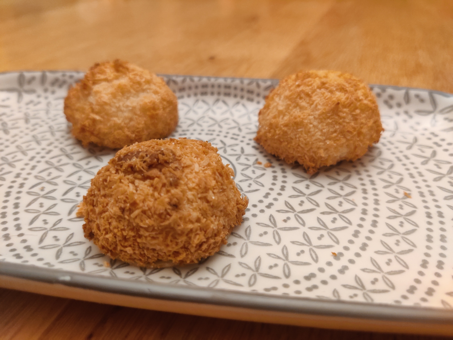 Eiweiß steif schlagen. Nach und nach den Zucker einrieseln lassen und den Zitronensaft hinzufügen. Zum Schluss die Kokosraspel unterrühren. Die Raffaelos halbieren (wenn man vorsichtig drückt, findet man die Nahtstelle der Waffeln). Auf jede Oblate jeweils ein halbes Konfekt setzen und mit 1 TL der Kokosmasse kuppelförmig abdecken. Dabei empfiehlt es sich, immer ein Schälchen mit Wasser stehen zu haben, denn wenn man die Fingerspitzen etwas anfeuchtet, lässt sich die Masse einfacher formen. Das Ganze dann bei 160°C (Ober-/Unterhitze) 20 Minuten backen, bis die Makronen eine leichte goldgelbe Färbung erhalten.